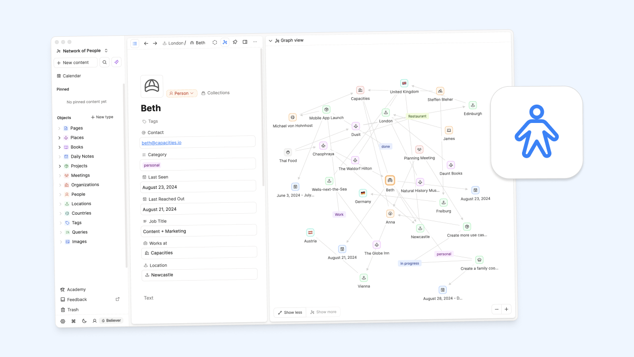 In Capacities, every note you take is an object, not a standalone document. Think of objects in the way you would think of real-world things; books, films, people, places.