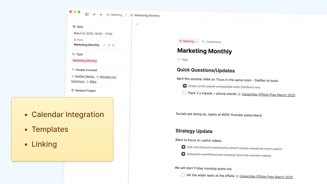 Capacities reimagines note-taking by treating every piece of information as an “object,” such as books, films, people, or places. This object-based approach moves away from traditional folder structures, allowing for a more natural and interconnected organization of knowledge. Each object type can have specific properties tailored to its nature—for instance, a media object might include properties like star ratings or genres. This flexibility enables you to create and link objects in a way that mirrors real-world relationships, which encourages a more intuitive and efficient way of managing your knowledge.