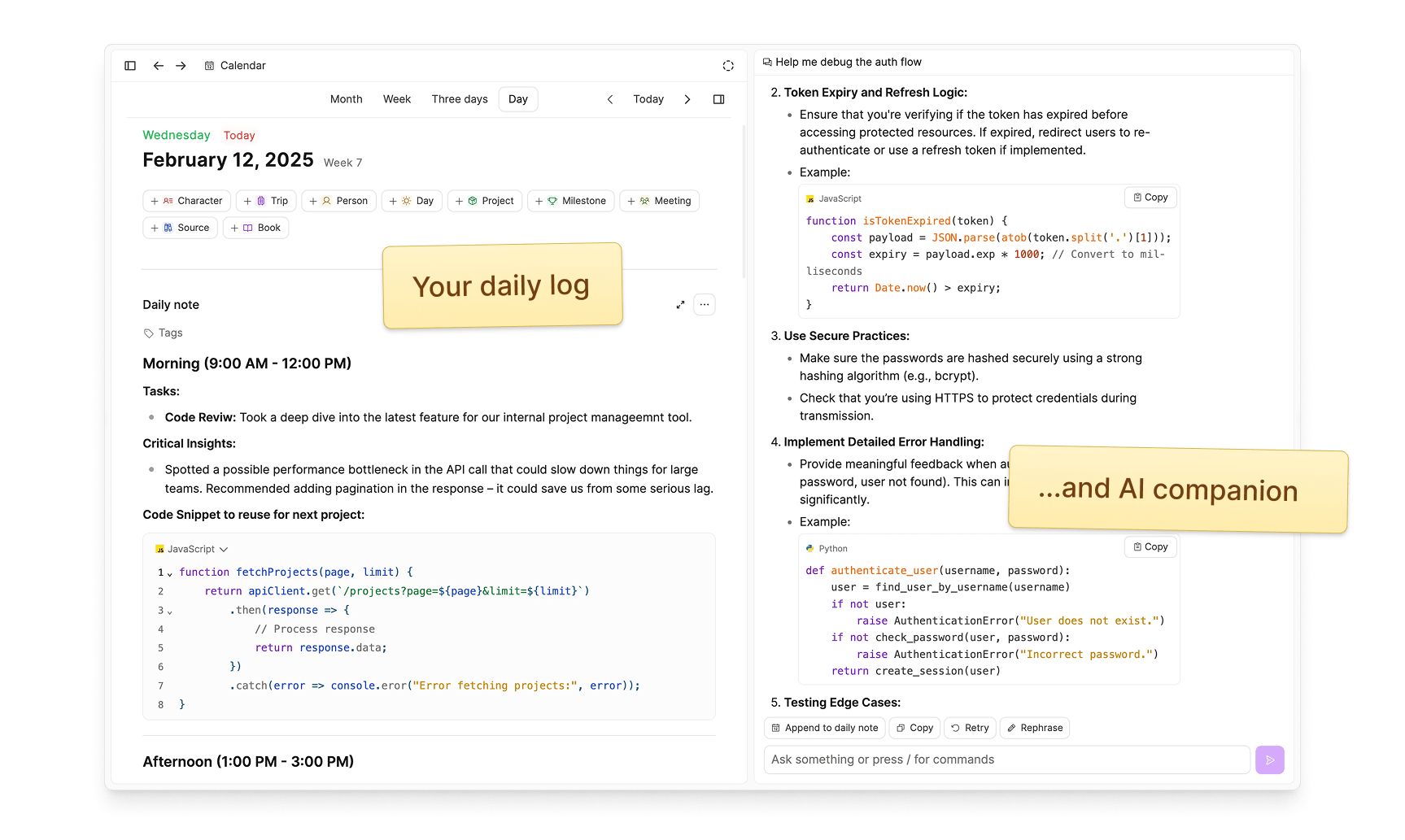 Keep track of daily tasks, and reflect on your learnings from the day and consult the AI Assistant to help you with your code.