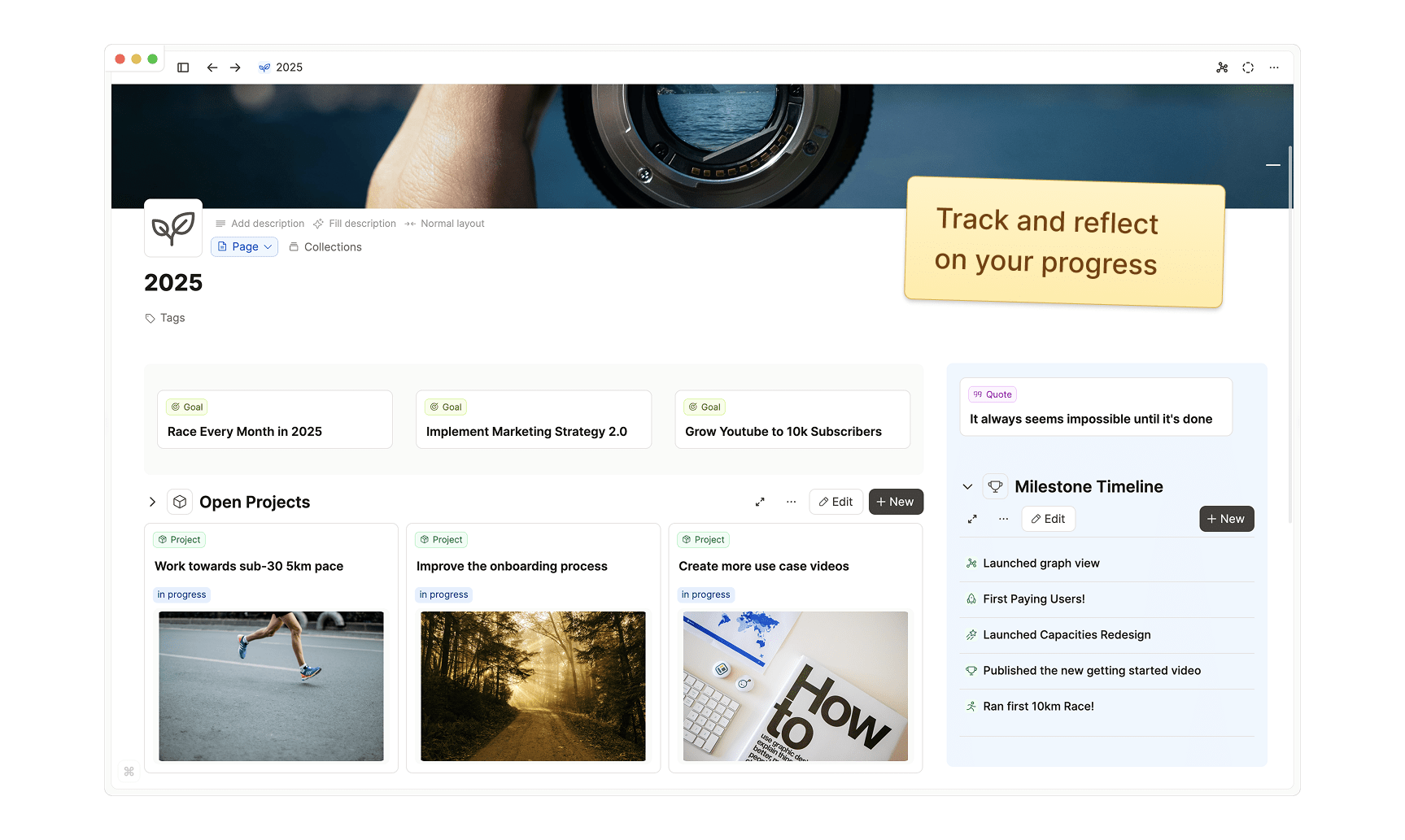 Use Capacities to keep track of your inspiration, your ideas, and the resources you've gathered along the way. Capacities will be your companion; a useful tool for reflection, thinking, and deep work.