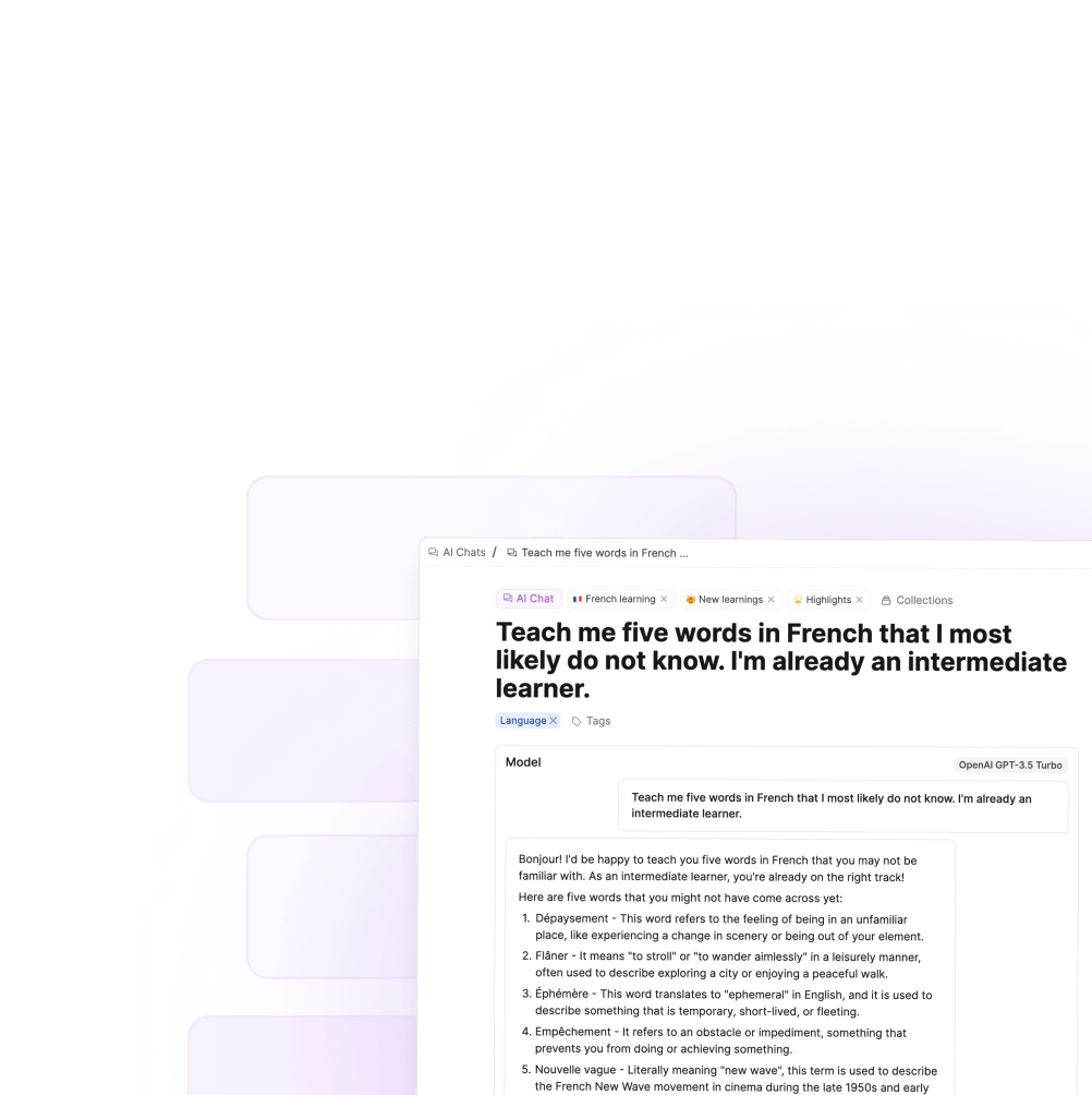 Embark on a learning journey with your notes, supercharged by the AI assistant. Ask questions, get answers, and keep the conversations that expanded your mind.