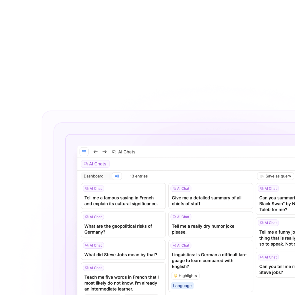 Let our powerful AI assistant help you do your best thinking. Use Capacities AI to dynamically interact with any object in your notes. Ask questions based on your content, or let it help you spark new ideas.