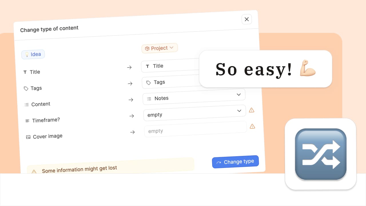 Sometimes the object type you first assign an object in Capacities is no longer the best fit. Changing an object type is super easy, you just need to make sure all the information has somewhere to go in your new object.