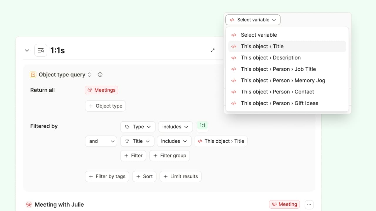 Tag queries are the third type of queries in Capacities, that you can quickly put together from your tag pages.