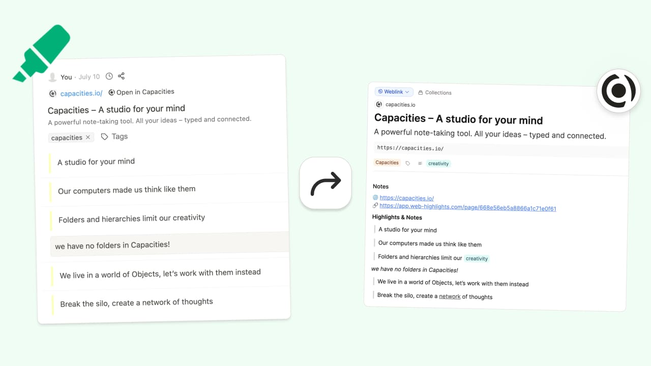 Bring highlights into Capacities with the Web Highlights Integration.