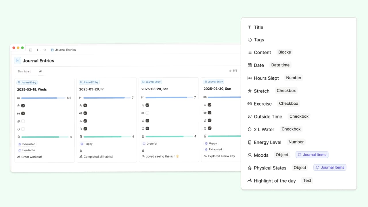 If you want to keep track of data like your sleep, mood, etc., and keep a journal in a dedicated place instead of the daily notes, creating a custom object type for journaling is the way to go.