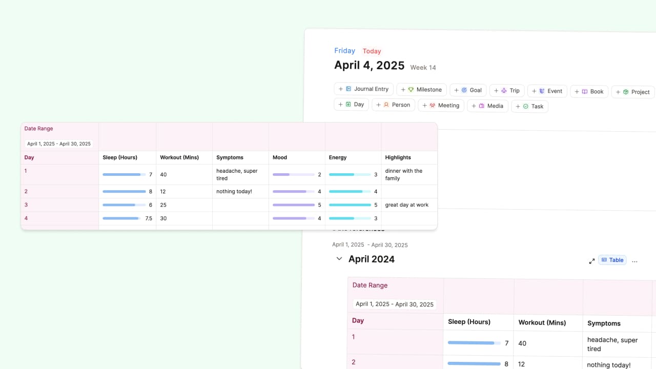 If you want an easy way to track your sleep, workouts, mood, and more (and do some calculations using the Capacities Pro in-table formulas feature), a tracking system using tables comes in handy!